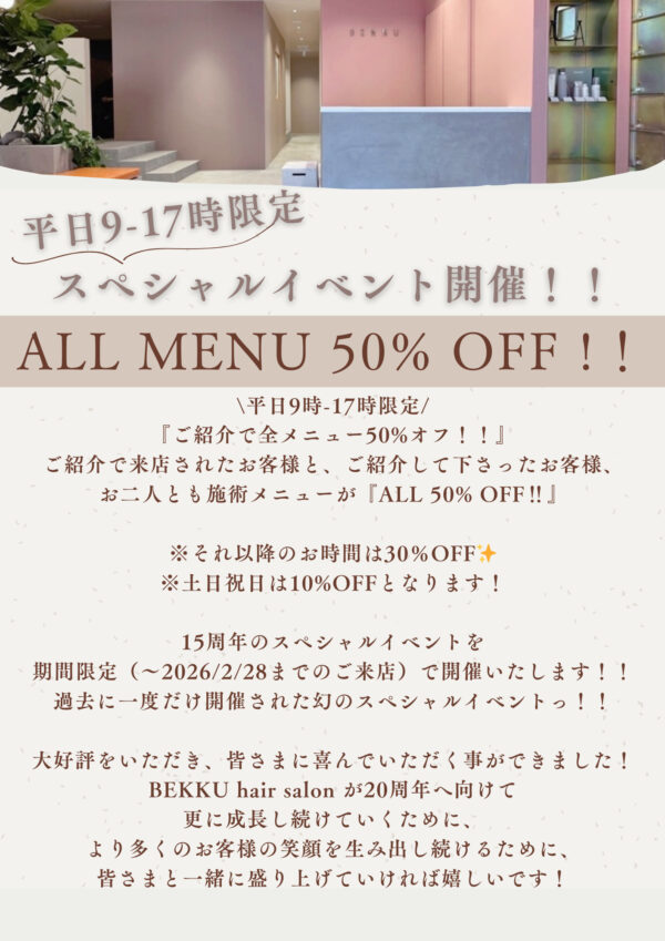 『ご紹介で全メニュー50%オフ!!』 ご紹介で初来店されたお客様と、ご紹介して下さったお客様、
