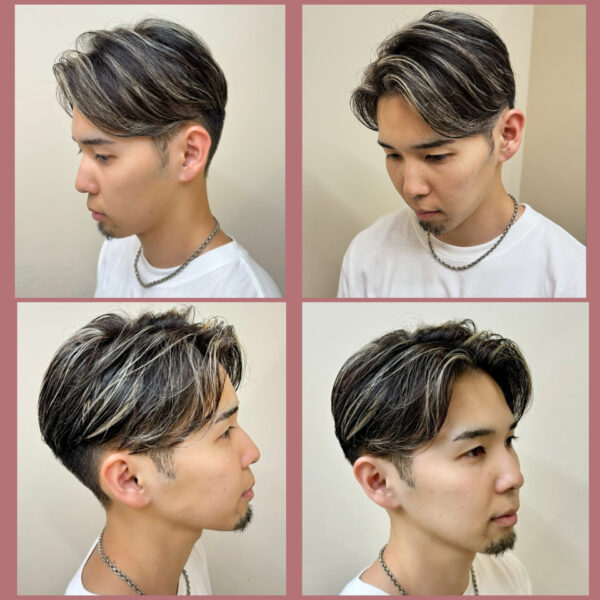 毛流れが綺麗に見える細めのハイライト!白と黒のコントラストがかっこいいセンターパートアップバングスタイル